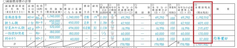 収支内訳書の2ページ目の「減価償却費の計算」の未償却残高(期末残高)の数値が前期末残高です。それぞれの減価償却資産を「建物・構築物」「農機具等」「果樹・牛馬等」に分けて計算します。