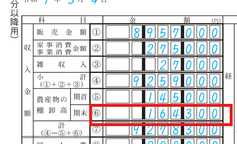 農作物の期首残高は、白色申告でも計算する必要があるので前年の収支内訳書の1ページ目の収入金額の欄を確認しましょう。農産物の棚卸高の期末に数字が入っている場合には、この金額が今年の期首残高になります。数字が入っていない場合は0円です。