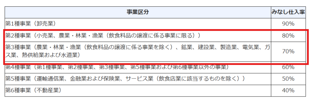 みなし仕入れ率は、事業区分により違います。農業の場合は飲食品の譲渡に係る事業の場合は第2種の80%、飲食品の譲渡にかかる事業以外は70%になります。食用の農作物の売上(収入)が3/4以上であれば仕入率は80%です。