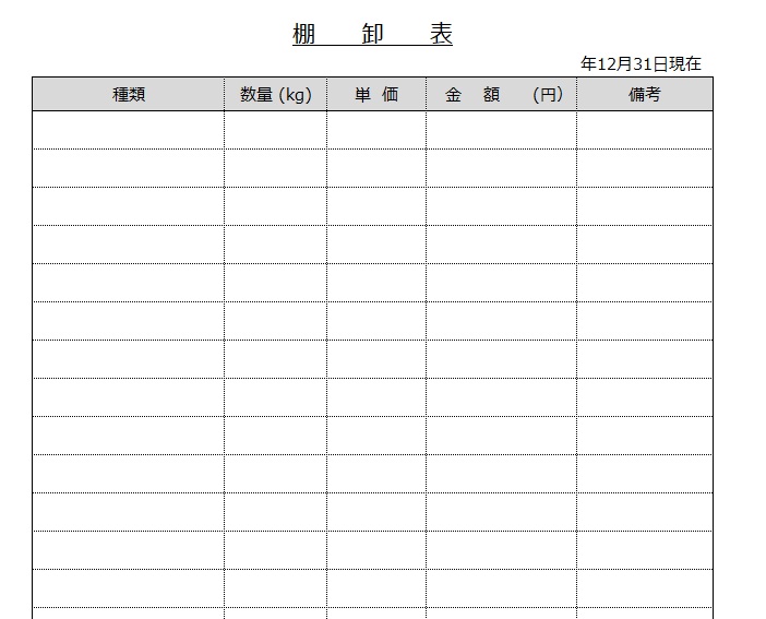 農産物の棚卸表の書き方は、数量は、実地棚卸で数えた在庫数(単位kg)、単価はその農産物を収穫した時の生産者販売価格(庭先裸価格)を使います。
