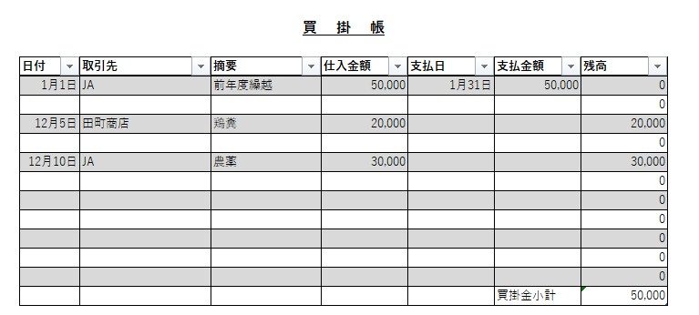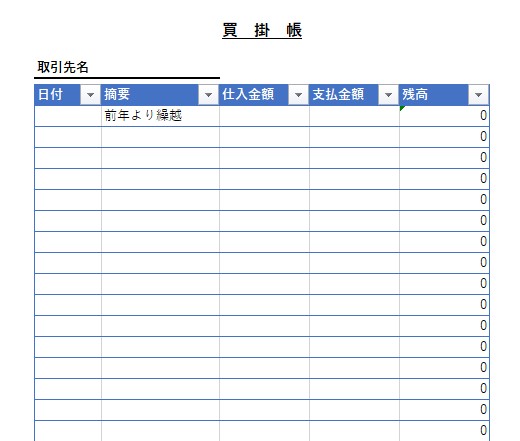 買掛帳の書き方は、仕入先が多い場合は仕入先別に記載します。まず一番上には前年の買掛金残高を記載します。その後は、仕入をした日に仕入金額を記載、実際に支払った日に支払金額に金額を記載します。