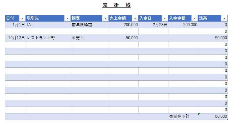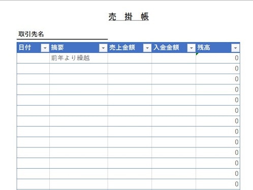 売掛帳の書き方は、取引先が多い場合などは取引先別に記載します。まず一番上には前年の売掛金残高を記載します。