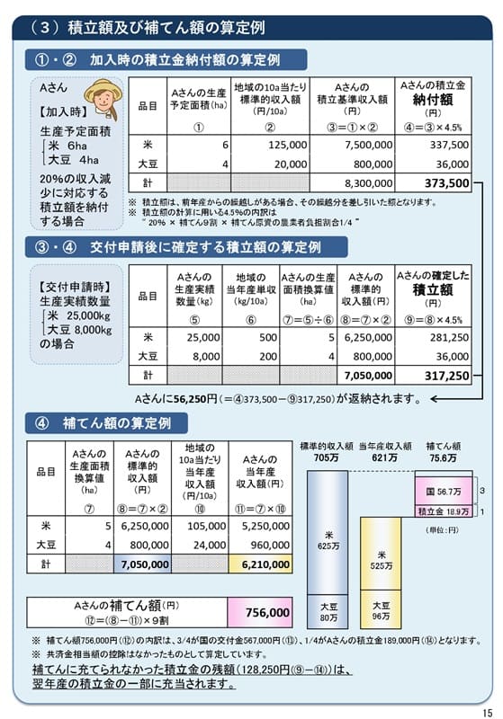 補てん額は、その年の地域の10aあたりの収入額が確定し、標準収入額と比べて下がっている場合にその差額の9割を補てんします。補てん額の1/4が自身の積立金から、残りの3/4は国の交付金から支払われます。