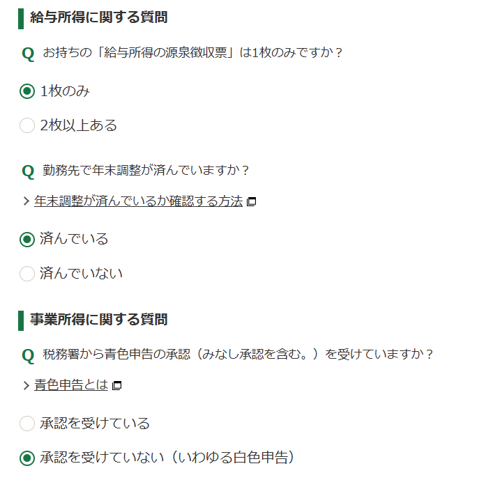 給与所得に関する質問は、自分が該当するものを選びましょう。