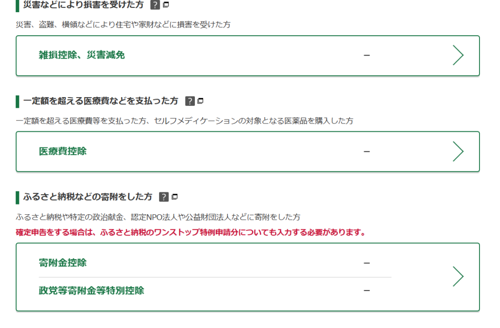 年末調整をしている場合でも、ふるさと納税や医療費控除などがある場合は支出に関する控除の額を入力します。年末調整を会社で行っていない場合は、社会保険料や年金等の控除、生命保険、地震保険等の控除もここで入力します。
