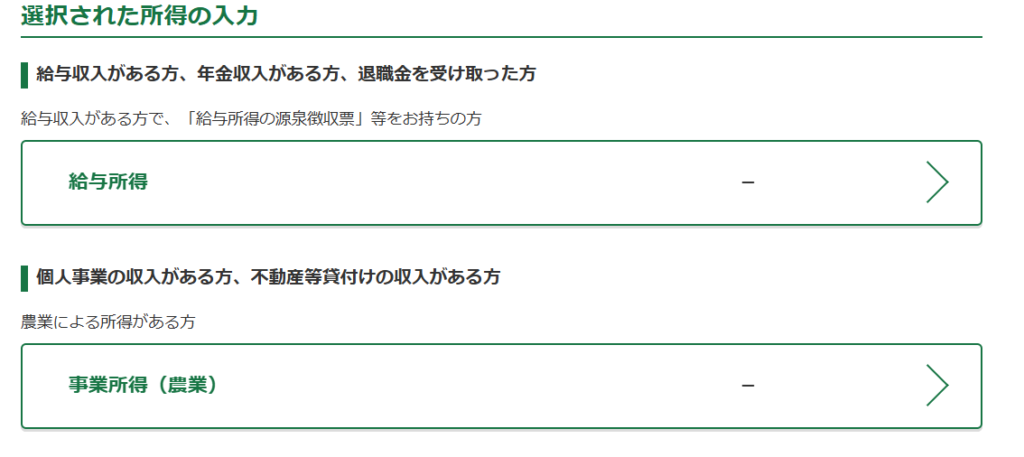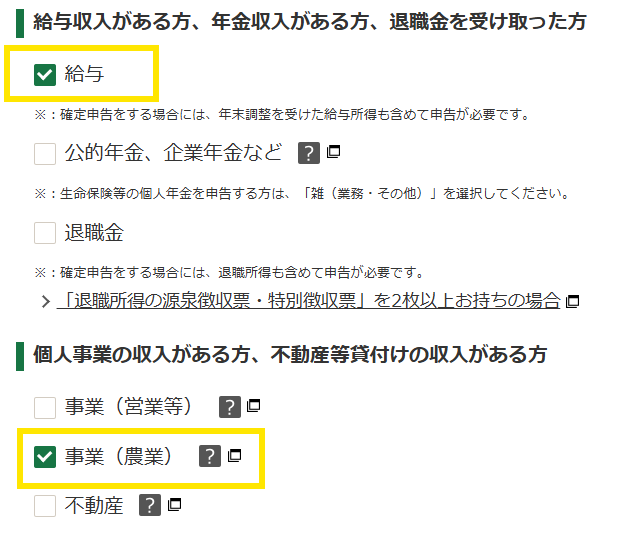 収入の選択のところでは、給与所得と農業所得の欄にチェックします
