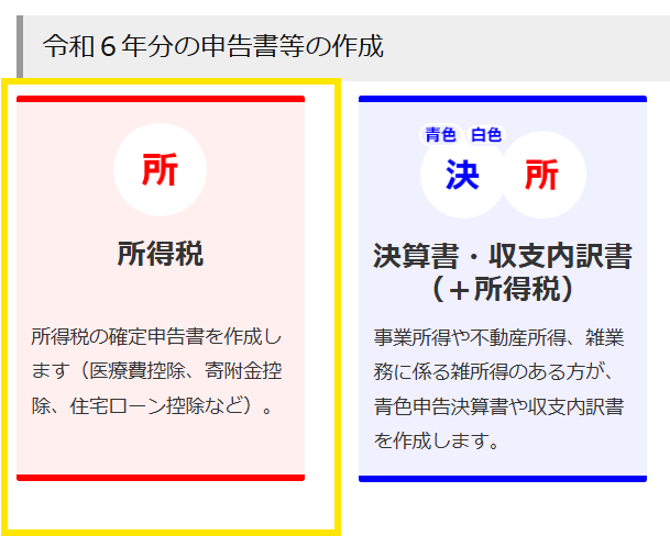 収支内訳書や青色決算書を別で作成し提出する場合は「所得税」を選びます。