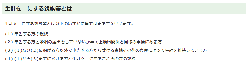 1の「生計を一にする」とはどのような状態の親族を指すのでしょうか。国税局の確定申告のよくある質問に下記の回答がされていました。
