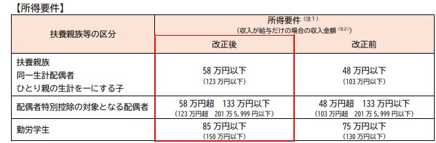 所得税の基礎控除の見直しに伴って、扶養の対象となる人の所得の上限が引き上げられました。金額が変わりました。いわゆる103万円の壁といわれる金額が123万円に変わります。