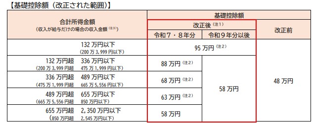 改正前は基礎控除の額は所得に関係なく「48万円」だったものが、最大95万円に変更になります。(金額は下記参照)