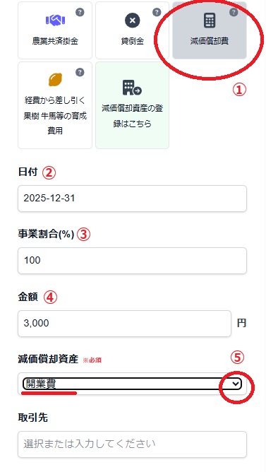 - ②で繰延資産を選ぶと5年が自動的に反映されるのでそのまま。
