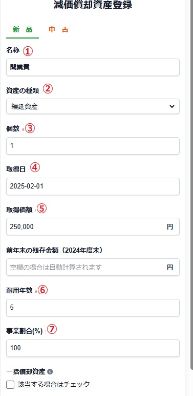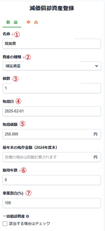 - ②で繰延資産を選ぶと5年が入っているので「0」を入力