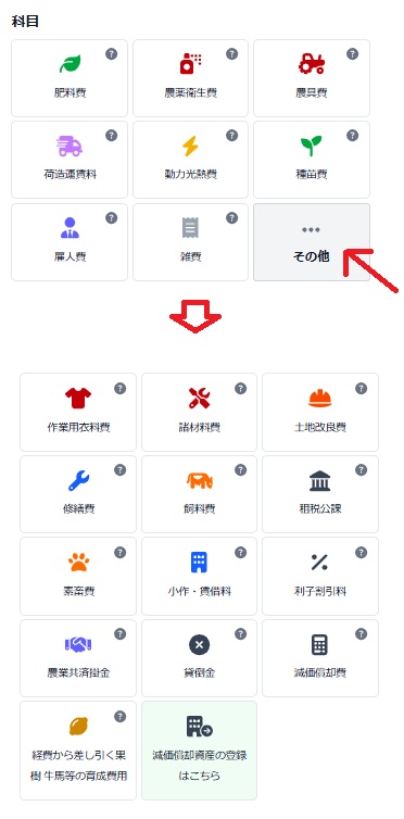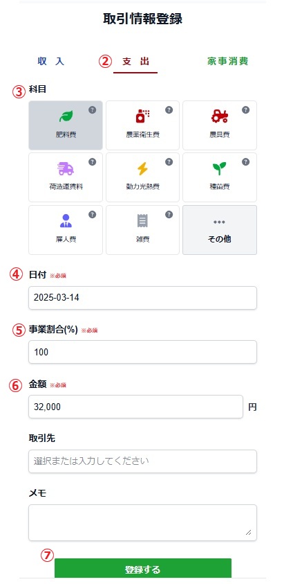 農業事業に関わる支出は、必要経費として科目ごとに区分して入力します。