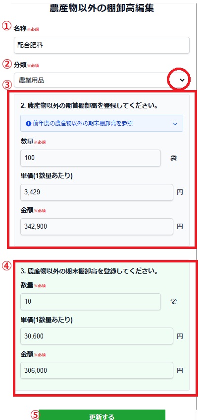 - 期首棚卸高(前年12月末時点)を入力(数量と金額は必須)、前年にない場合は0円で登録
