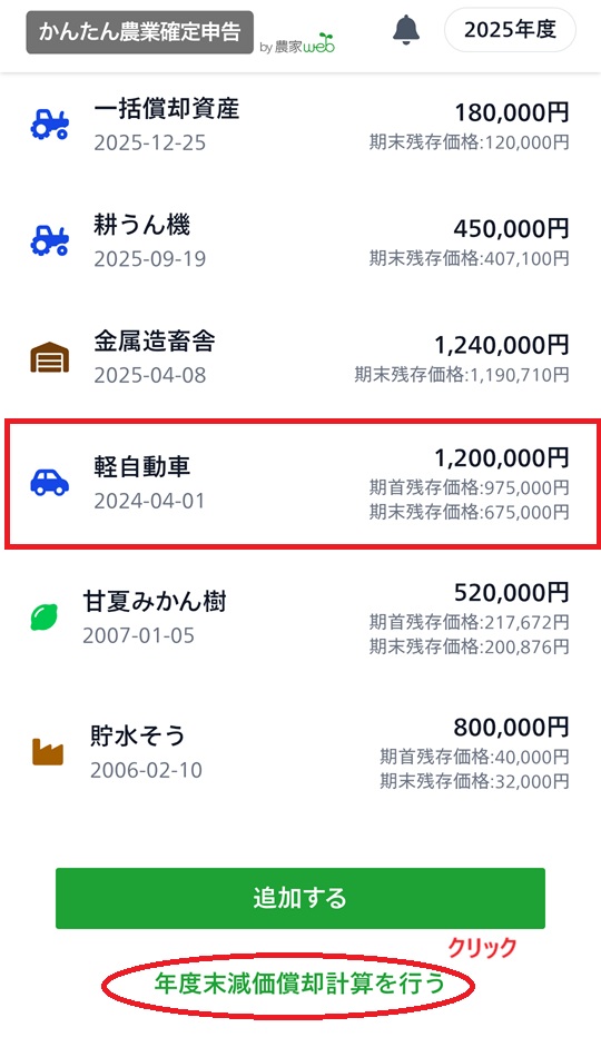 画面一番下の「年度末減価償却計算を行う」をクリックorタップしていただきますと、減価償却費が計算され、