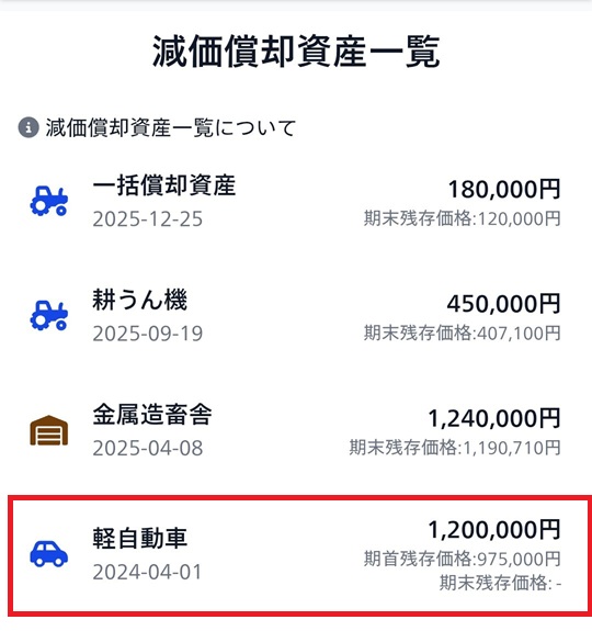 そのため減価償却一覧画面では、期末残存価格が「ー」になります。