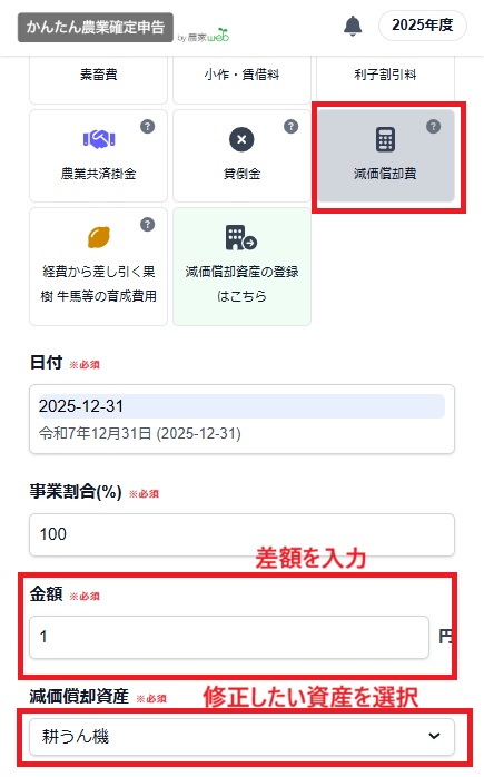 数値を直したい場合には、取引情報登録の支出から減価償却費を入力してください。