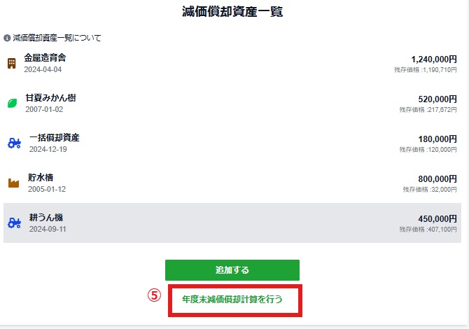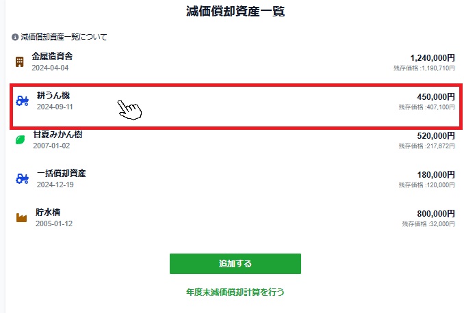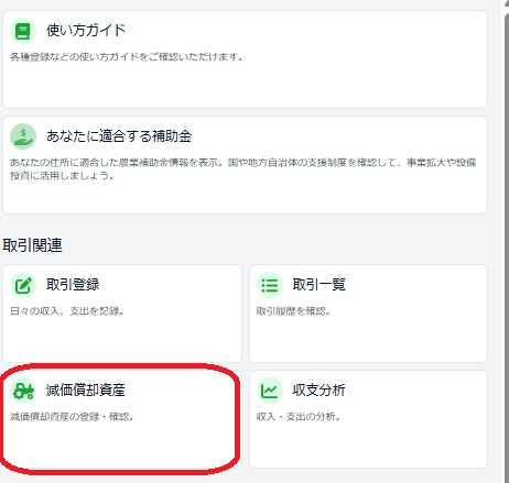 - 「取引先登録」→「支出」→「減価償却資産の登録はこちら」→「減価償却資産一覧」