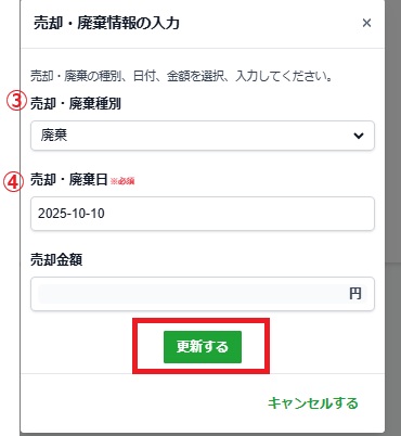 - 廃棄日を入力して、「更新する」ボタンを押す