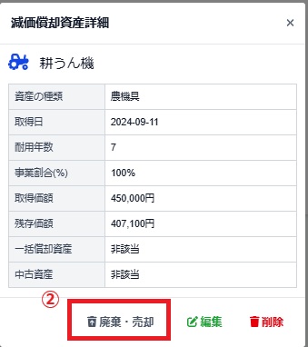 - 減価償却資産詳細画面の下の廃棄・売却ボタンをクリック